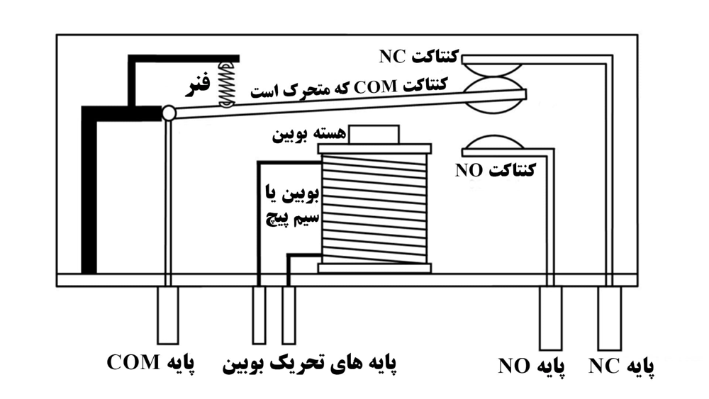 - سیمپیچ (بوبین): یک سیم مسی نازک که به دور یک هسته آهنی پیچیده شده است. با عبور جریان از سیمپیچ، یک میدان مغناطیسی ایجاد میشود. این قسمت محرک اصلی رله است و با تغذیه شدن آن، رله فعال میشود.